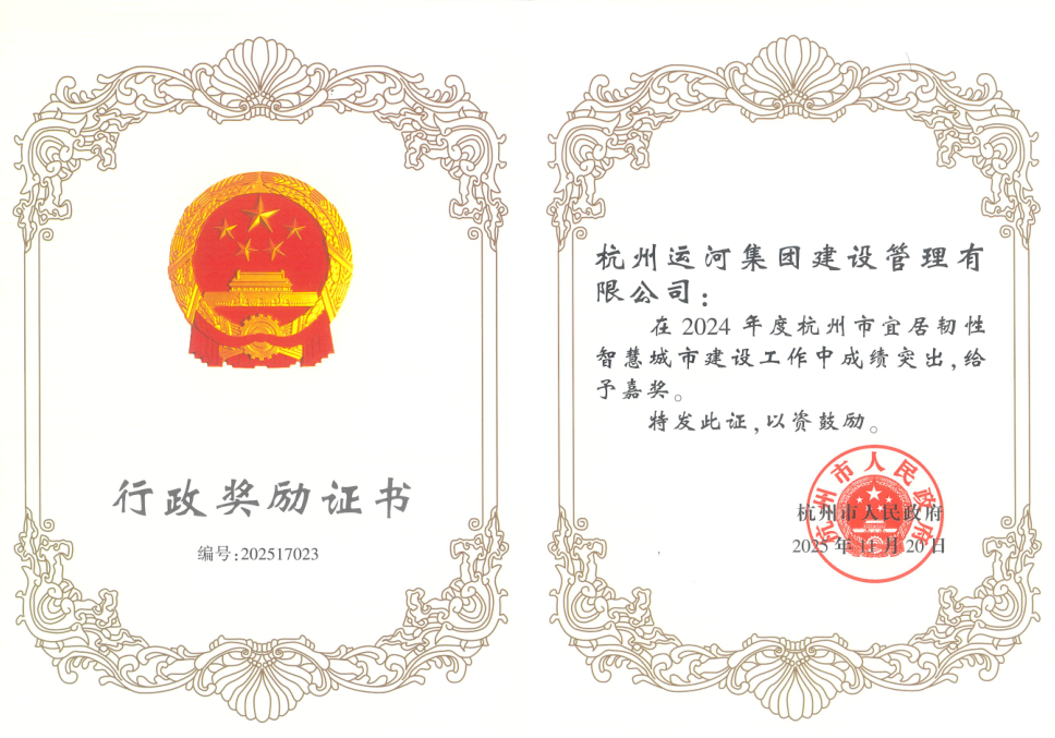 来源:运河建管 浏览次数:7次 2025-12-05近日,杭州市人民政府办公厅正式发布《关于对宜居韧性智慧城市建设工作中成绩突出的集体和个人给予行政奖励的决定》,对在城市建设领域作出显著贡献的先进典型予以表彰,杭州运河集团建设管理有限公司荣获 “集体嘉奖”。